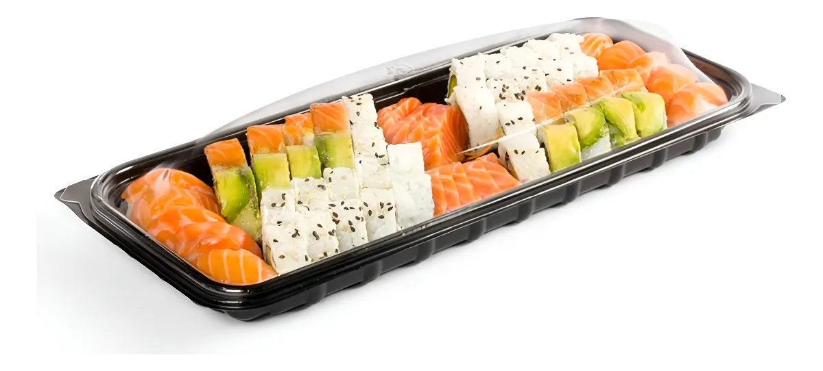 Con un diseño rectangular y costillas que proporcionan mayor estabilidad, estas bandejas son ideales no solo para sushi, sino también para una variedad de alimentos. Fabricadas en plástico de alta calidad, garantizan resistencia y durabilidad, lo que las convierte en una opción confiable para eventos, restaurantes o servicios de catering.