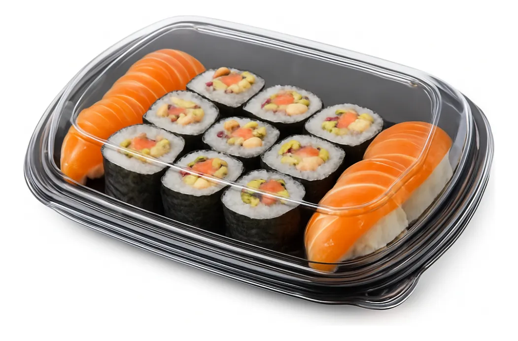 Marca Cotnyl, Modelo Bandeja 475. Tipo de bandeja SUSHI, Color Negro. Largo x Ancho x Altura 20.5 cm x 15.2 cm x 3.3 cm. Material plastico.
