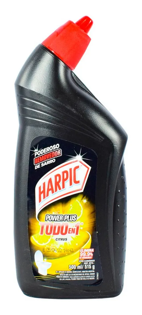 Harpic Removedor de Sarro x 500 ml Características: – Elimina manchas del inodoro – Elimina 99,9% de gérmenes – 500 ml. / 515 g. Gel líquido para eliminar el sarro del inodoro, con poder blanqueador, que elimina el 99,9% de gérmenes. Eficacia comprobada en Bacterias: Salmonella cholerasuiss, Staphylococcus aureus. Hongos: Cándida albicans, Aspergillus niger, Virus: SARS-CoV-2. Composición: Agua, Ácido Clorhídrico al 6,75% (Activo), Tensioactivos no Iónicos, Tensioactivos Catiónico, Fragancia, Colorantes